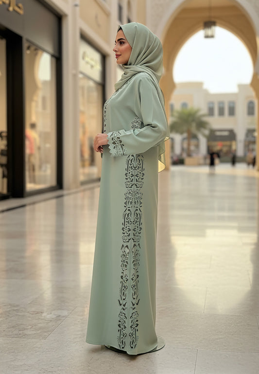 Soft Sage Green Abaya with Tonal Embroidered Panel | Nida Fabric-800