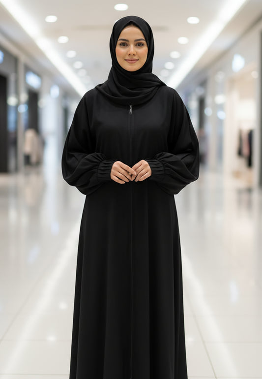 Zip-Front Nida Abaya with Volume Ruched Sleeves-812
