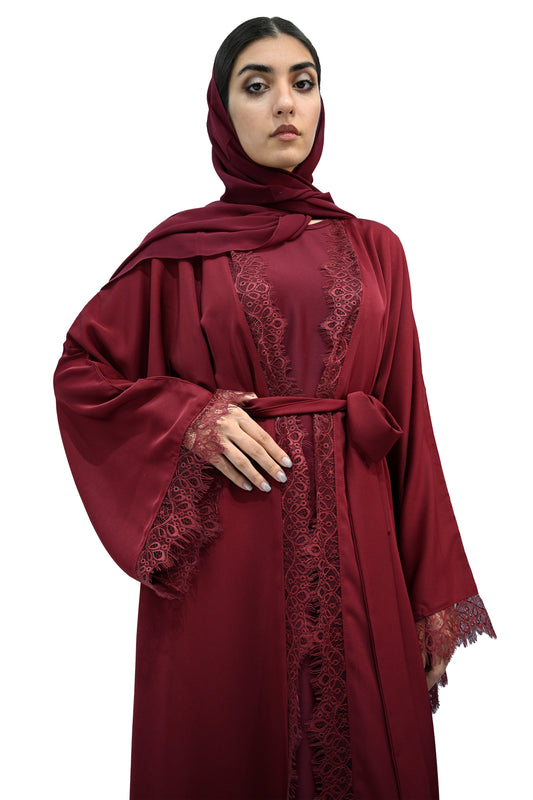Burgundy Lace abaya with belt & Hijab-694